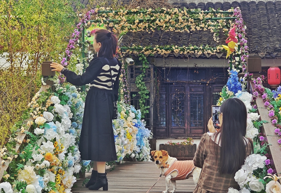 金山区山阳镇金山嘴渔村,两座花桥与渔村的古朴风貌相映成趣,成为打卡热门地 新民晚报记者 陶磊 摄