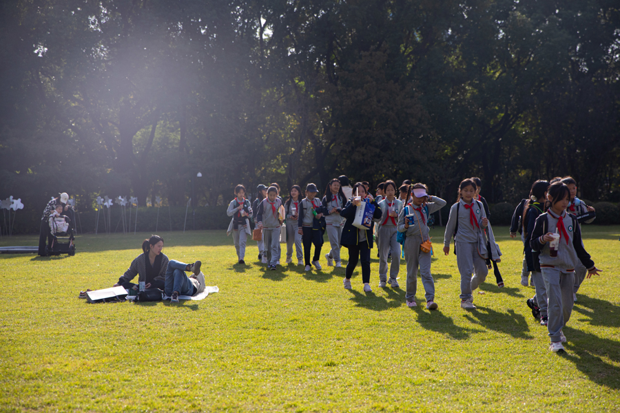 复兴公园里,一群群秋游学生沐浴阳光。草坪上,恋人也沉浸在秋天的浪漫中 新民晚报记者 周馨 摄