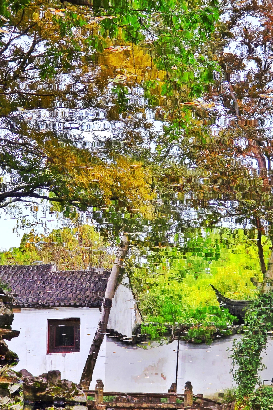 嘉定秋霞圃里,水中倒映出层次丰富的秋叶和白墙黛瓦,如一幅油画 新民晚报记者 张龙 摄